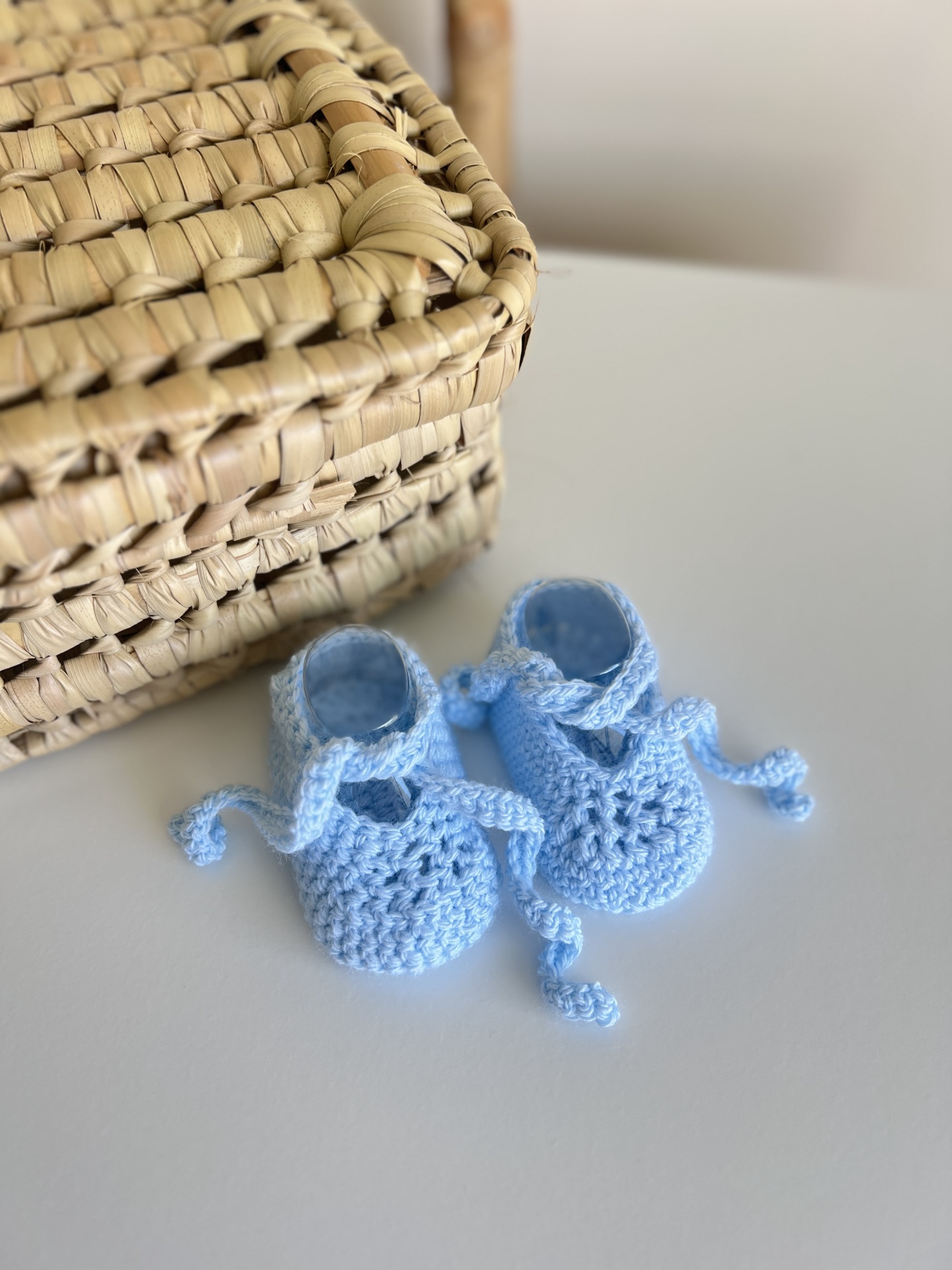 • Sapatinhos de bebé em crochet azul claro ao lado de caixa de palha trançada