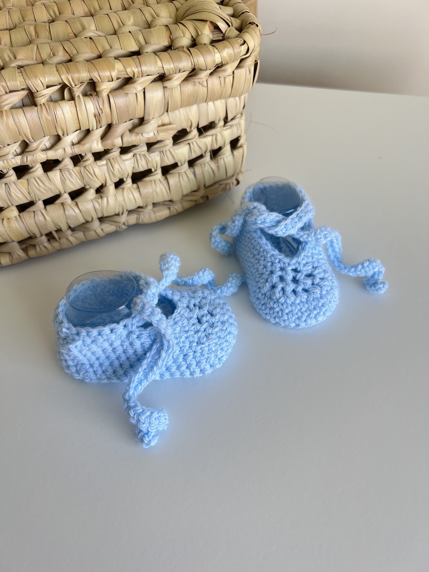 Sapatinhos de bebé em crochet azul claro ao lado de caixa de palha trançada