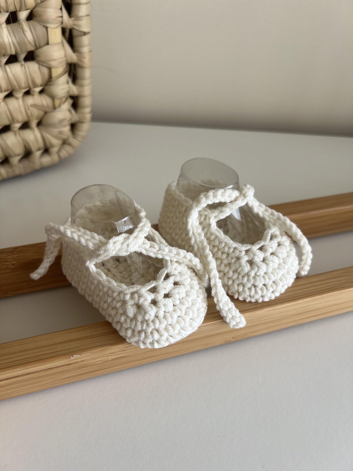 Os nossos carapins com laçada são cuidadosamente feitos à mão em croché, garantindo um toque especial de carinho e qualidade em cada par. Confeccionados em 100% fio de algodão, são extremamente macios e confortáveis, perfeitos para a pele sensível dos mais pequeninos.