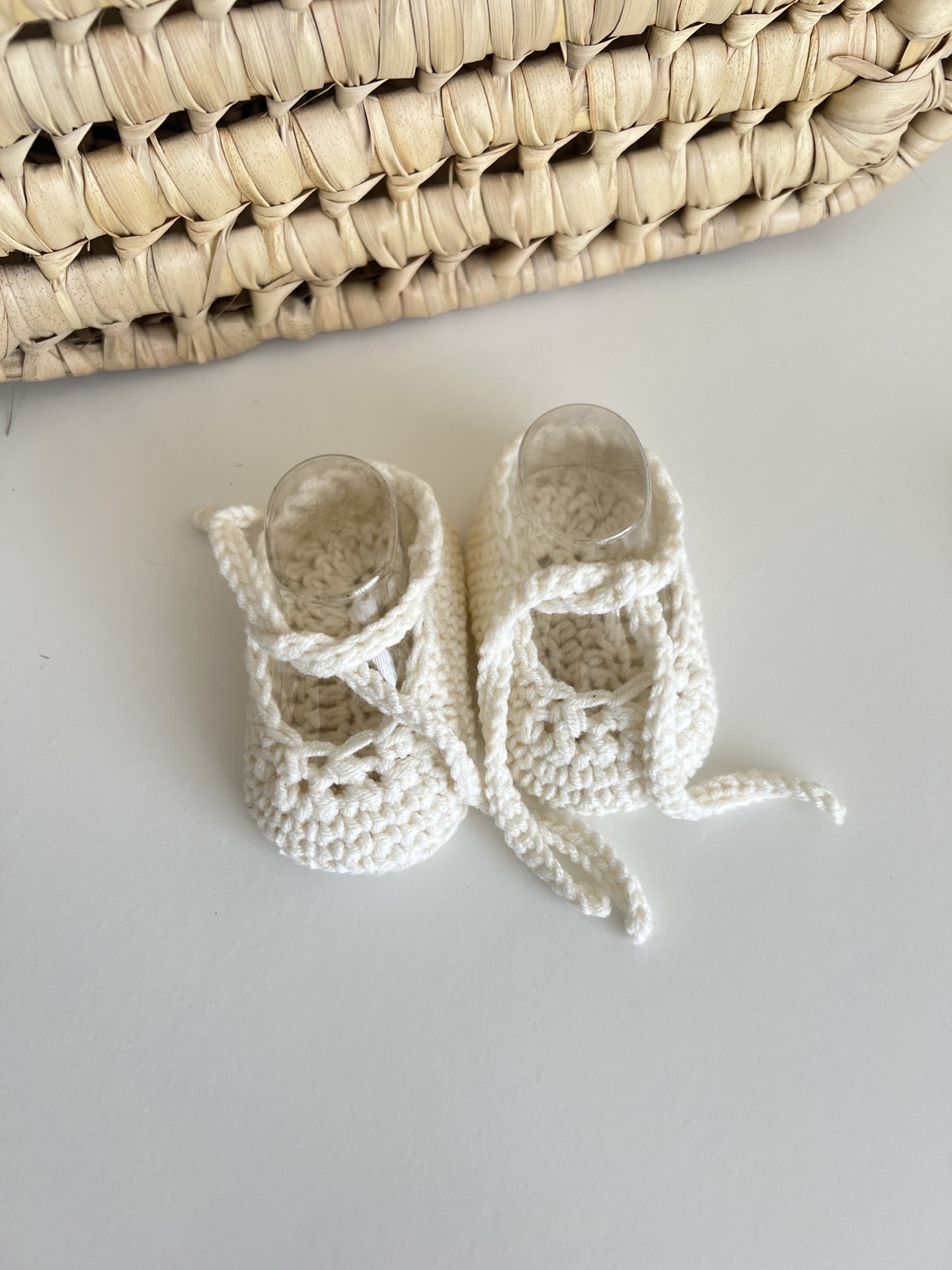 • Sapatinhos de bebé em croché branco com cadarços sobre fundo branco próximo de palha entrelaçada