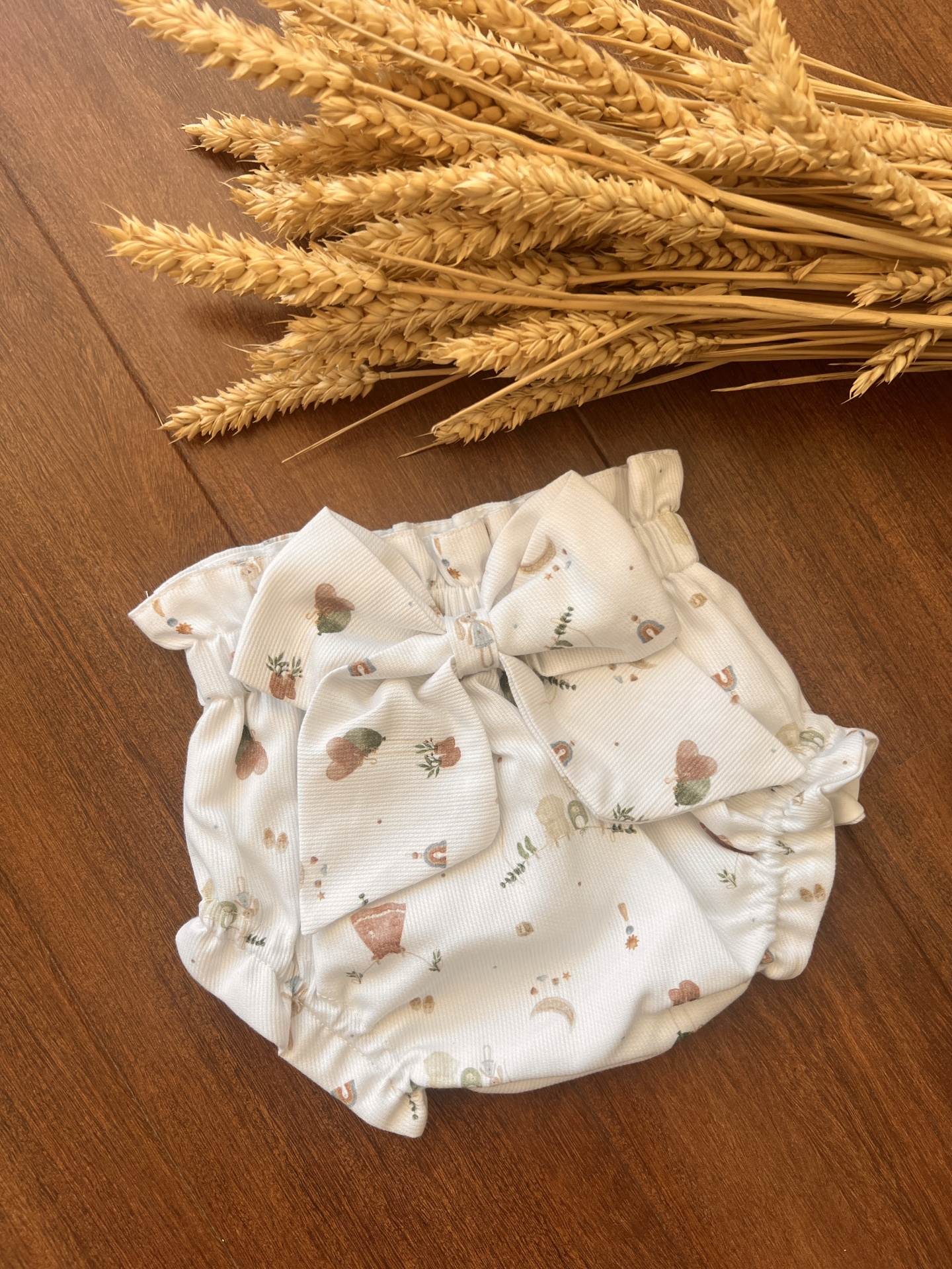 • Fralda de tecido branco com laço e padrão de corações e plantas em tons pastel