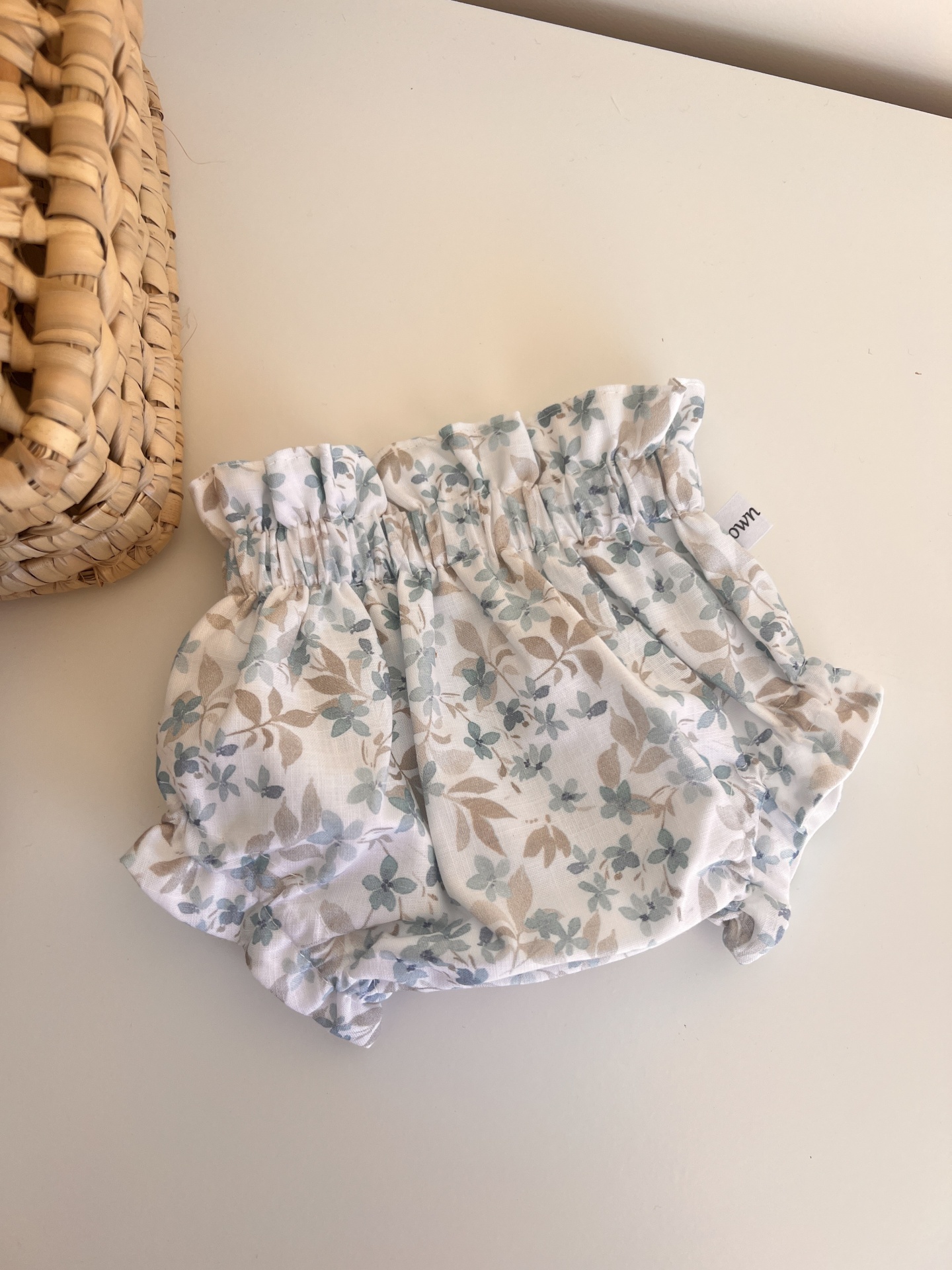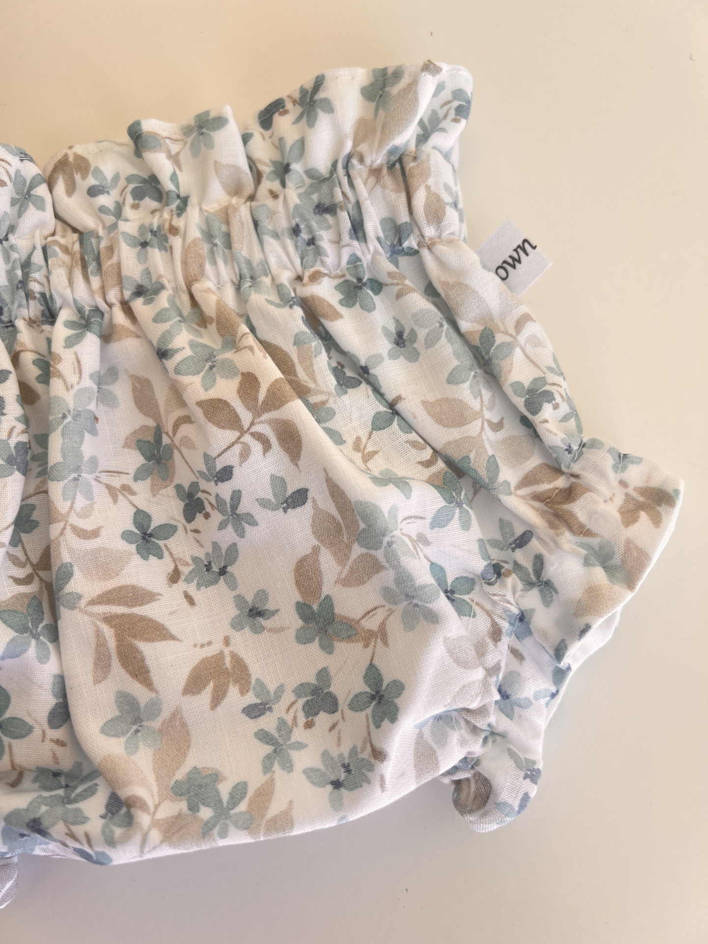 • Fralda ou culote floral branco azul e bege para bebé ao lado de cesto de palha