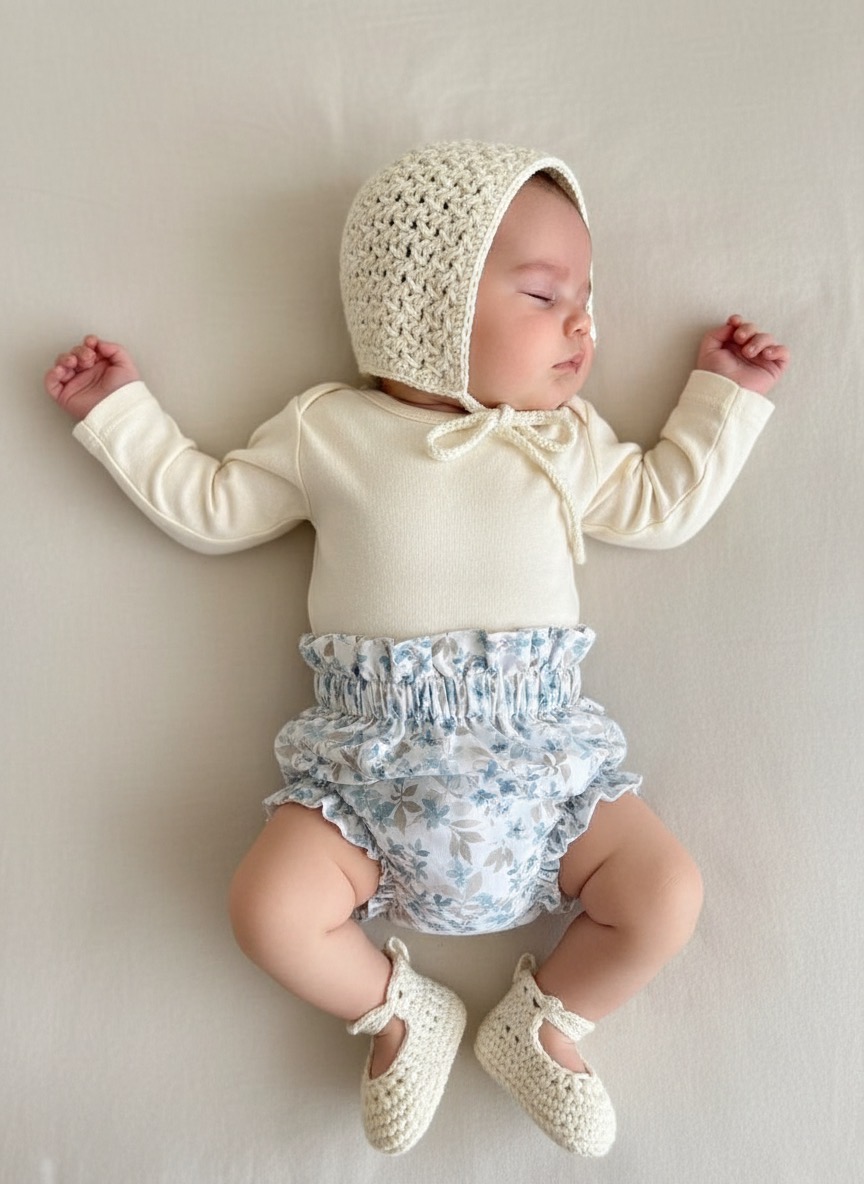 • Bebé a dormir com roupa creme, tapa-fraldas floral azul e bege, gorro e sapatinhos de malha creme