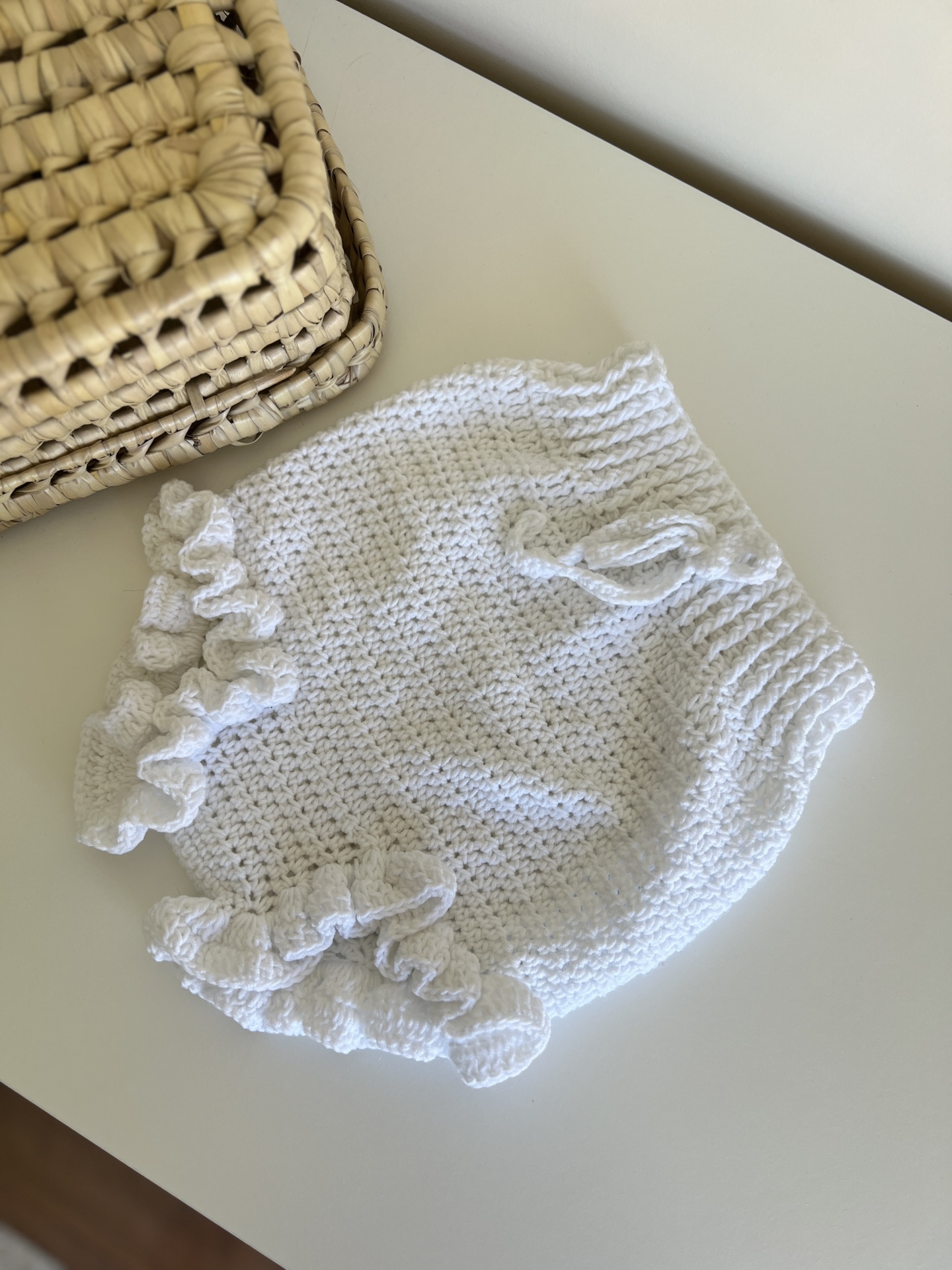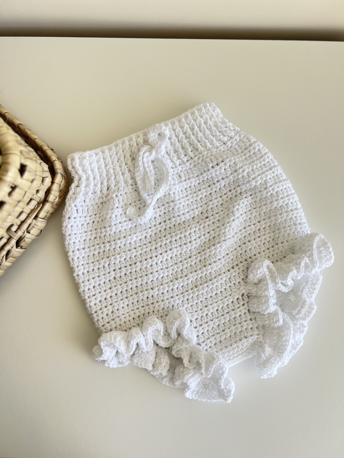 • Roupa de bebé branca em crochet com folhos colocada numa superfície branca ao lado de cesto entrelaçado