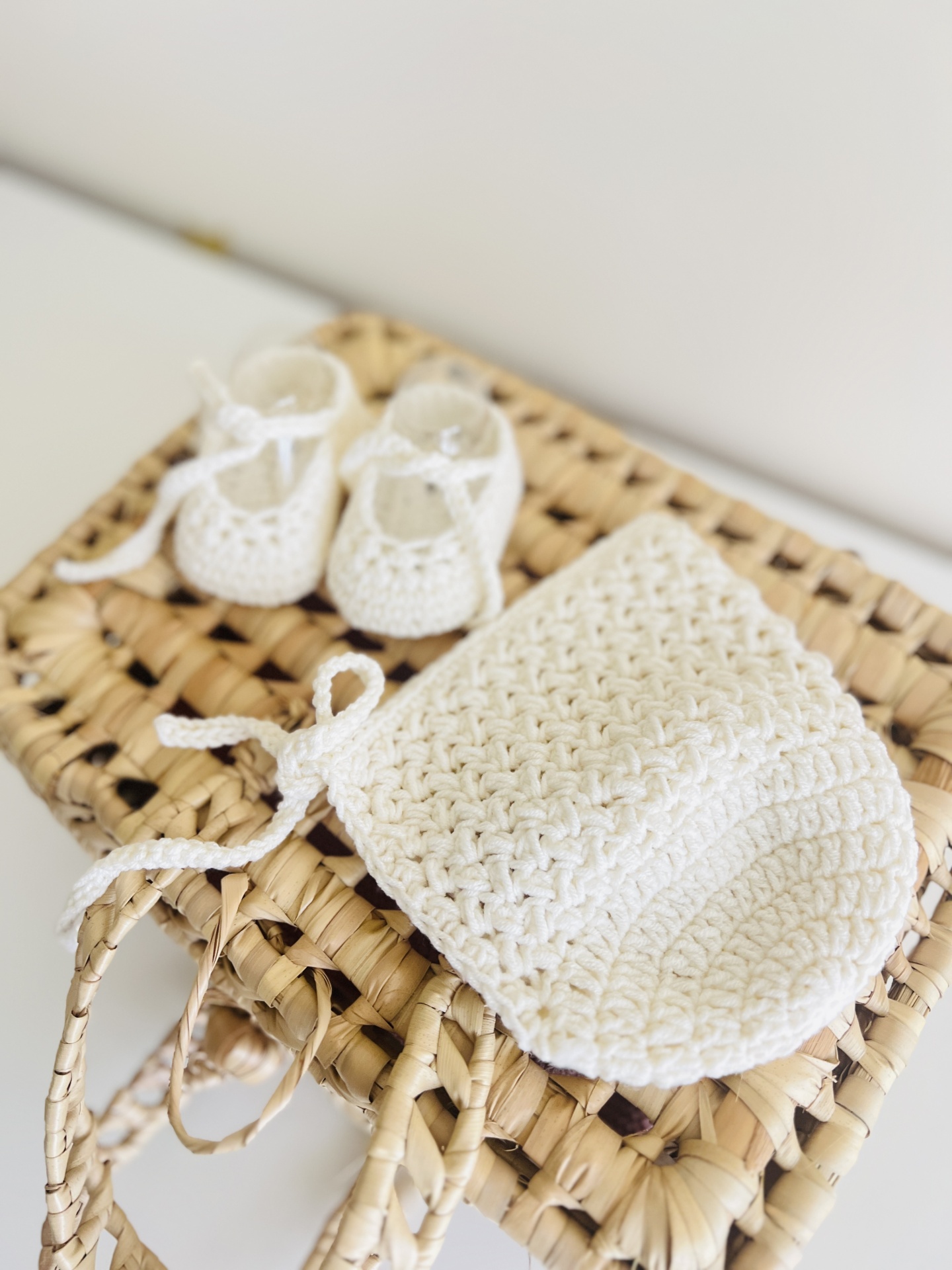 • Conjunto de sapatinhos e touca de bebé em croché branco sobre saco de palha