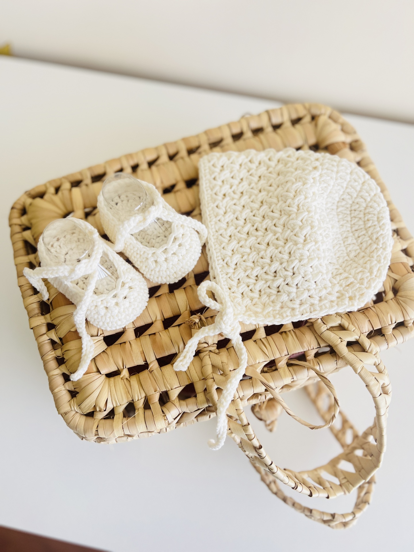 • Touca e sapatinhos de bebé em malha branca sobre cesta entrelaçada natural