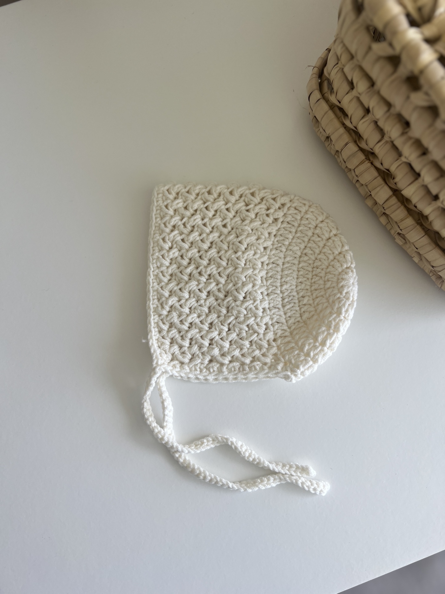 • Gorro de bebé branco em croché com fitas para amarrar junto a uma cesta de vime