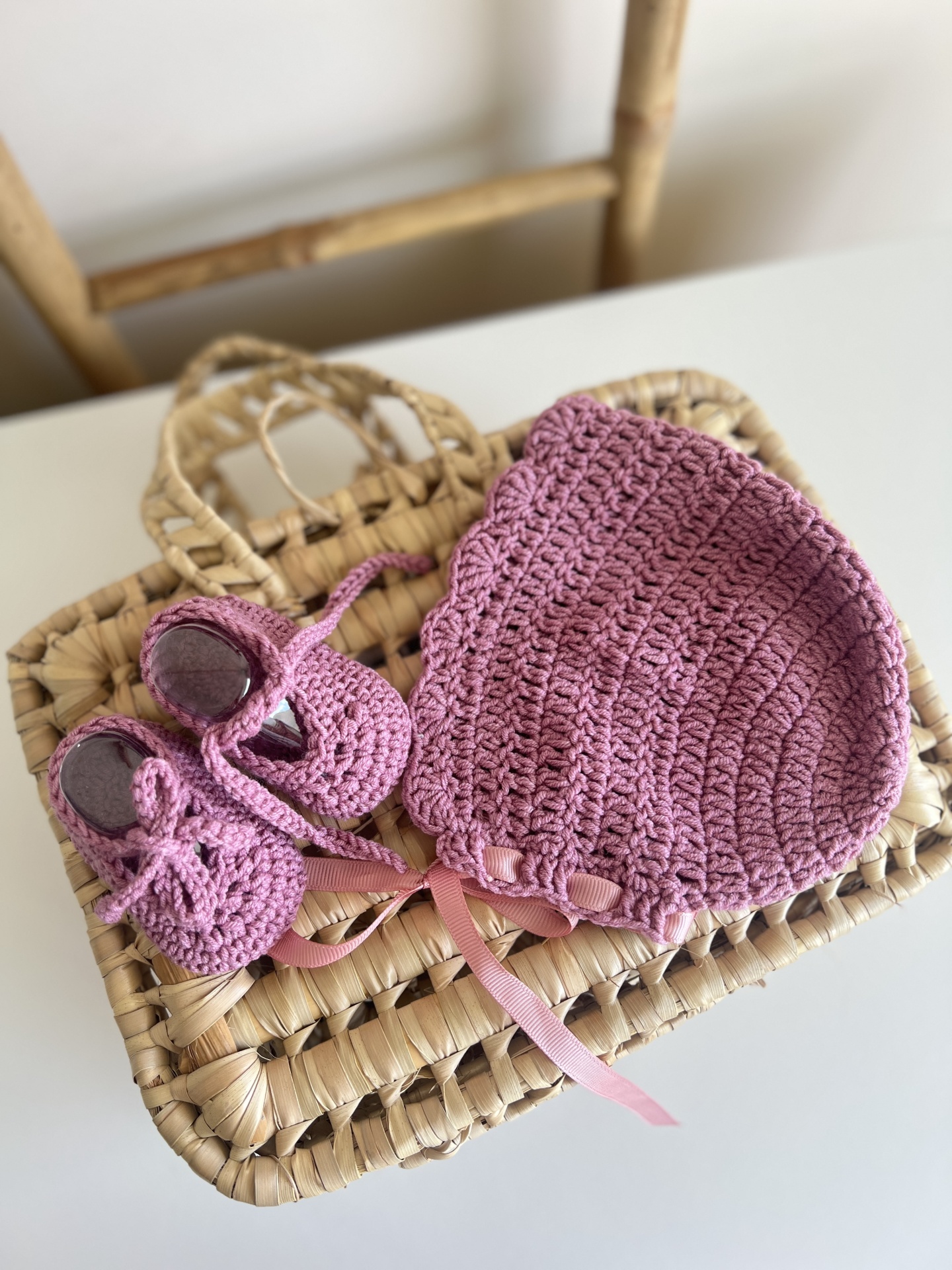 • Conjunto de chapéu e sapatos de bebé em croché rosa sobre mala de palha.