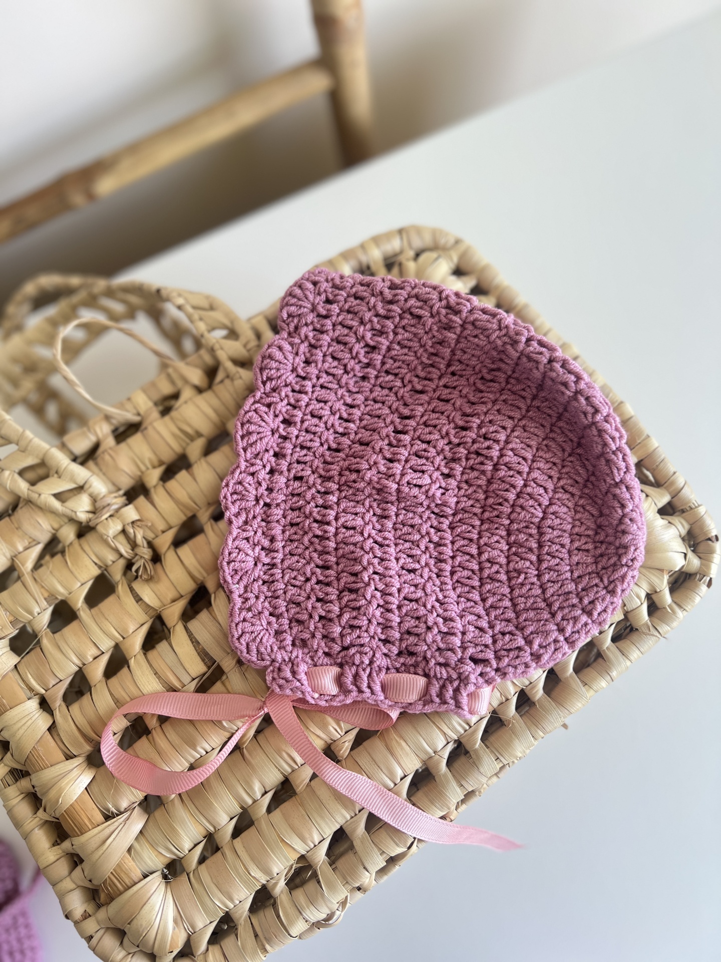 • Gorro cor-de-rosa claro de croché sobre cesta de palha clara