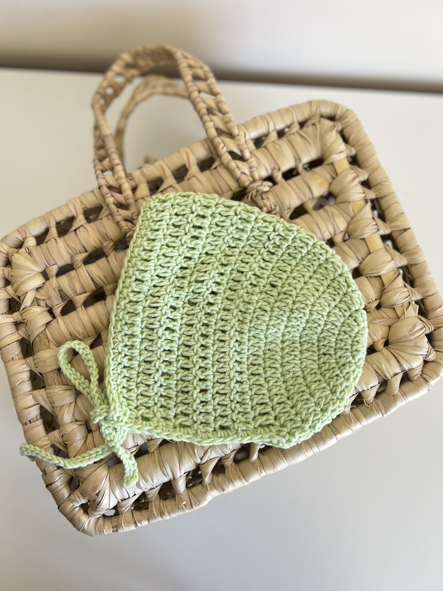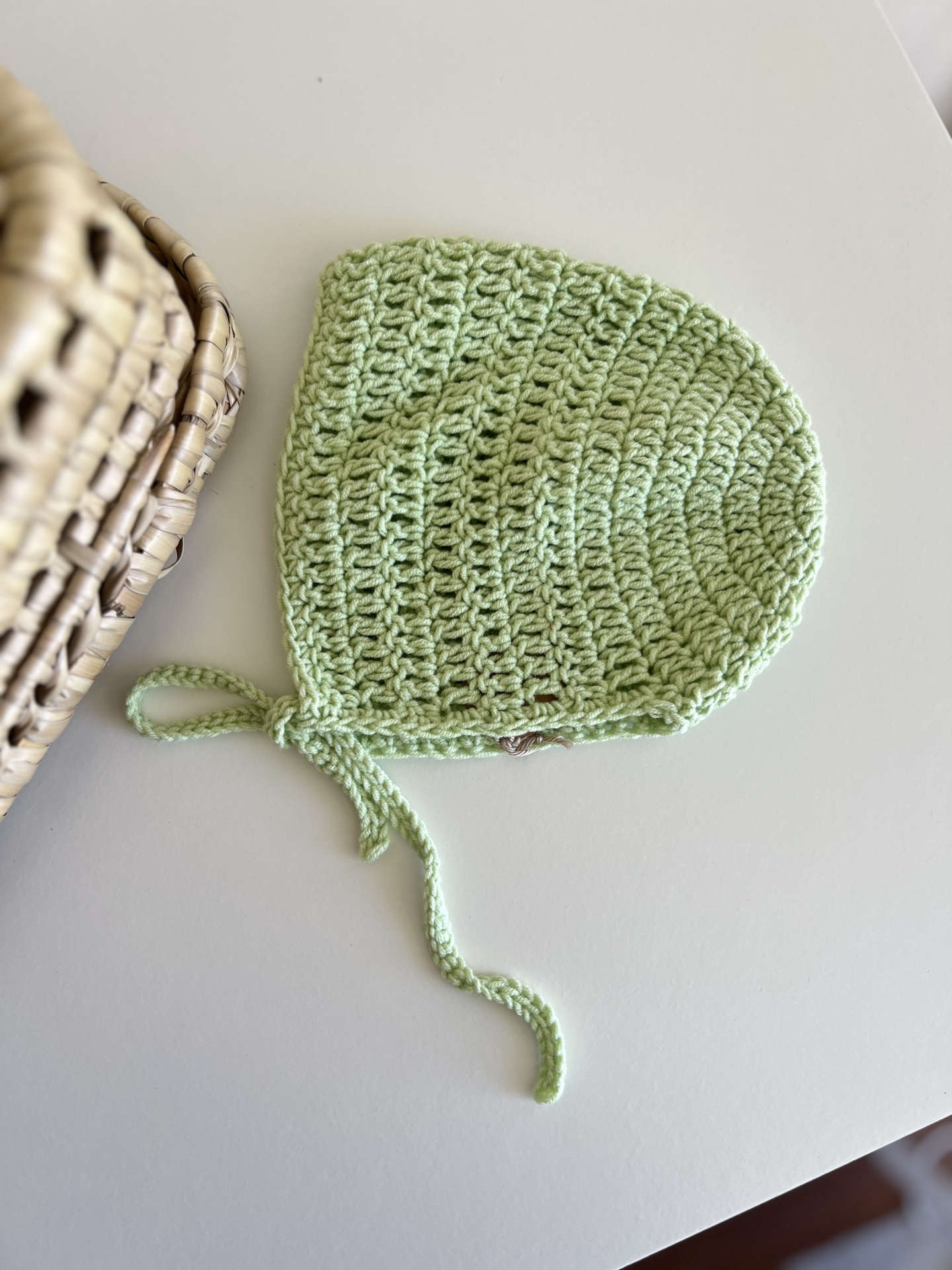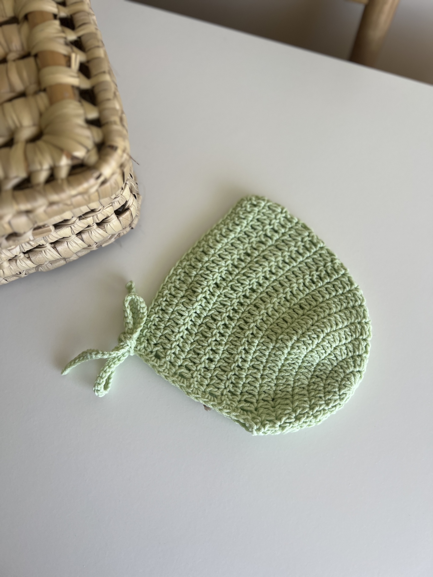• Gorro de bebé verde claro em crochet sobre mesa branca junto a um cesto trançado